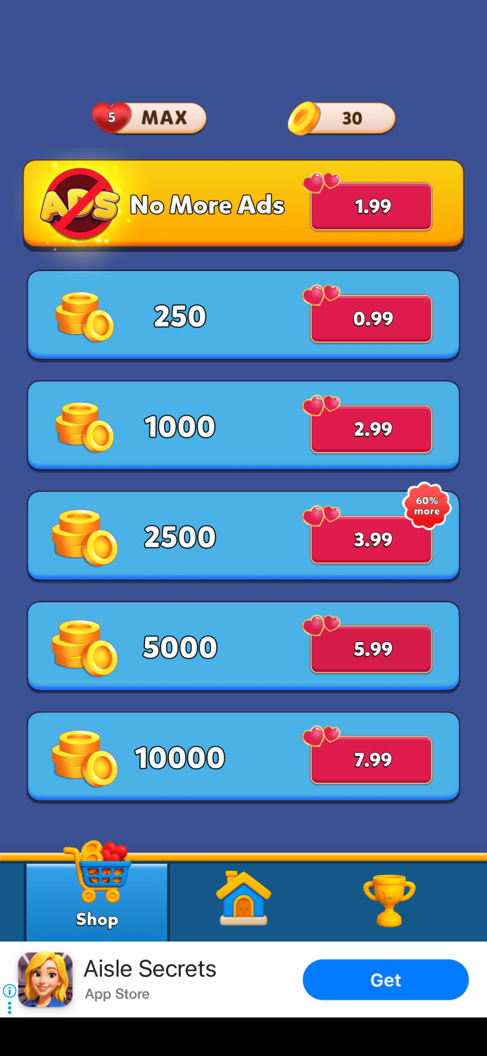 One interesting choice here is that the rewarded ad coin option appears on the main screen instead of inside the shop. In many games, this mechanic lives inside the shop interface, encouraging players to open the store regularly and reinforcing monetization habits.