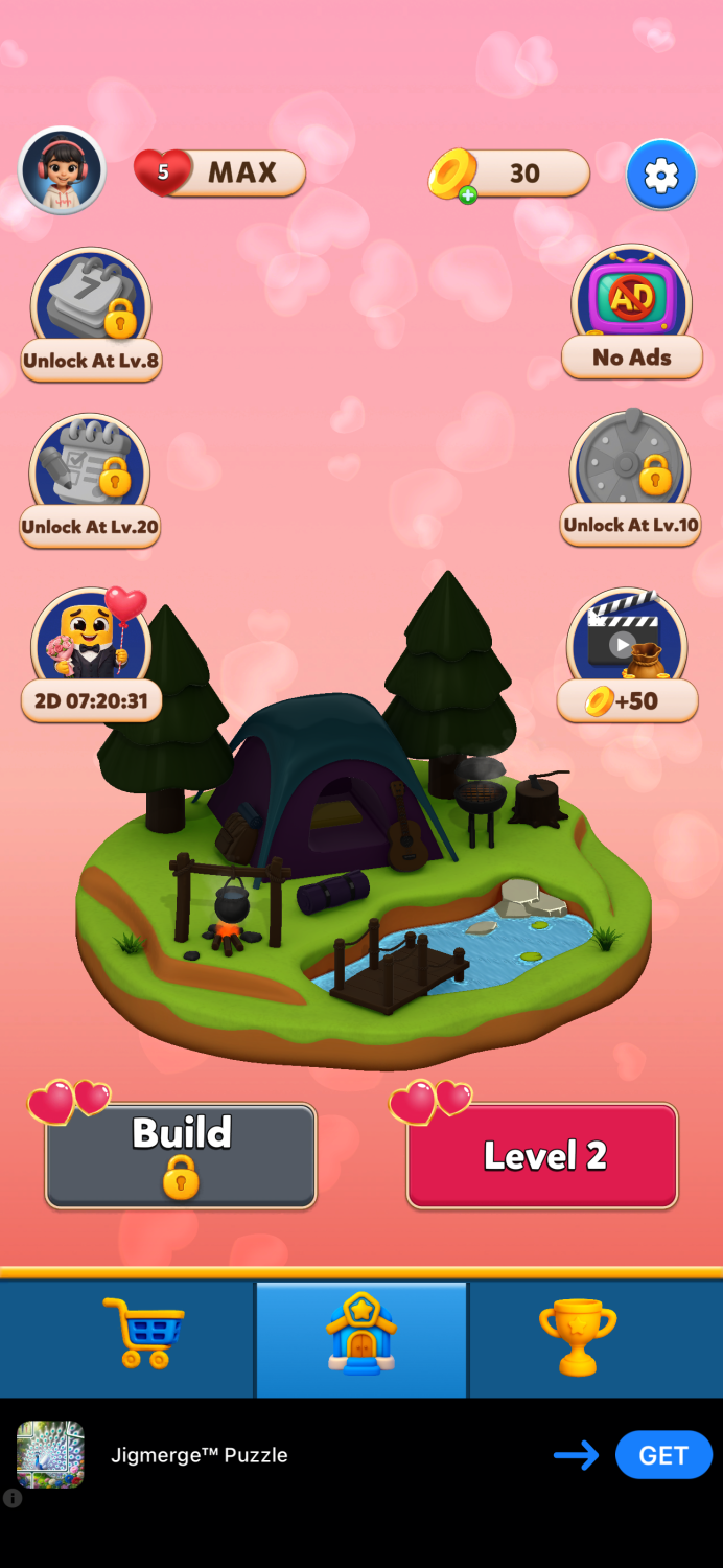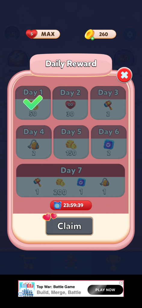 After completing roughly 50 levels, several sessions have passed, most core features are unlocked, and the early retention funnel has had time to work. This makes it a useful point to evaluate not only the gameplay, but also the surrounding UX design, monetization systems, and LiveOps structure.