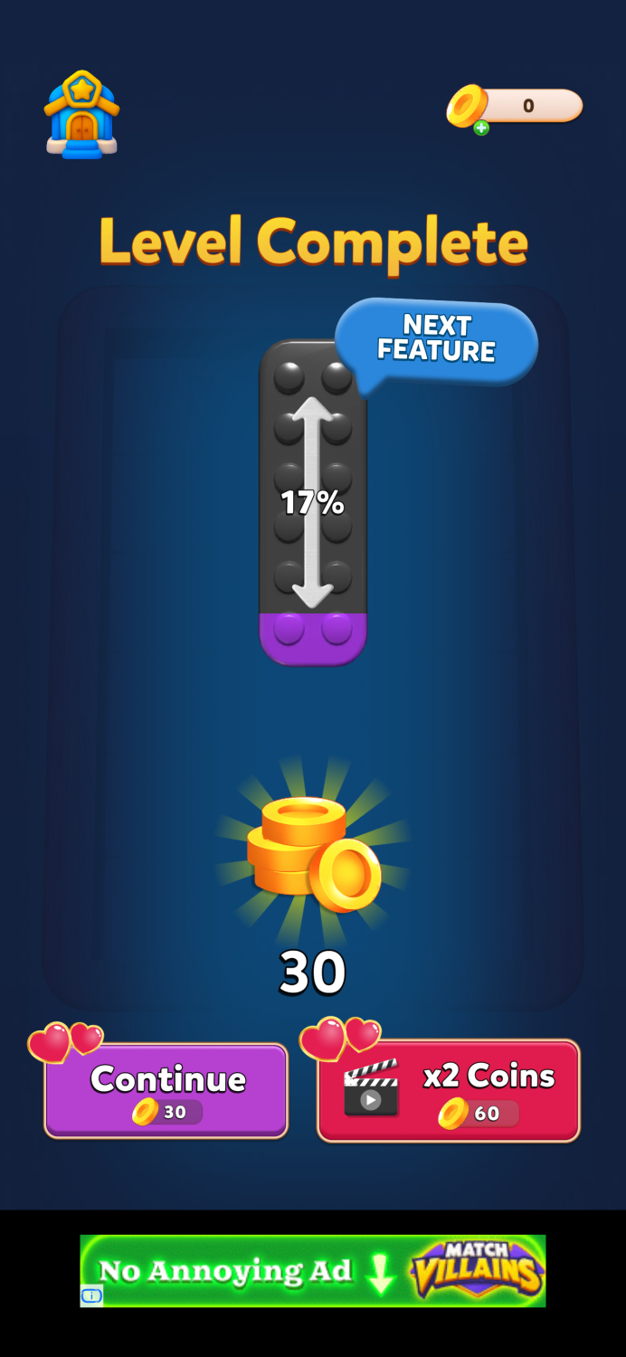 After finishing the first level, the game introduces a progress indicator showing how close the player is to unlocking the next feature. This is a strong design choice that builds anticipation and curiosity.