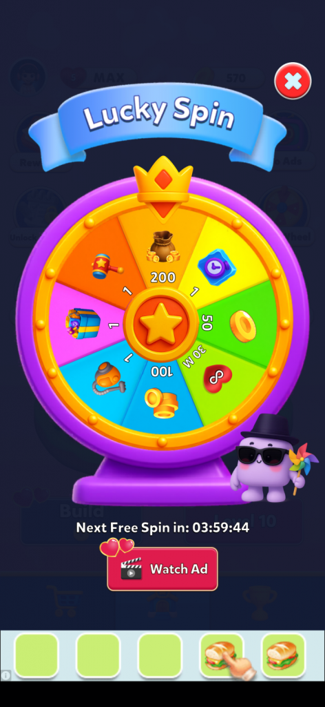 However, the main screen does not clearly signal when a free spin becomes available again. Since the wheel remains accessible through ad watches, the icon appears permanently active.